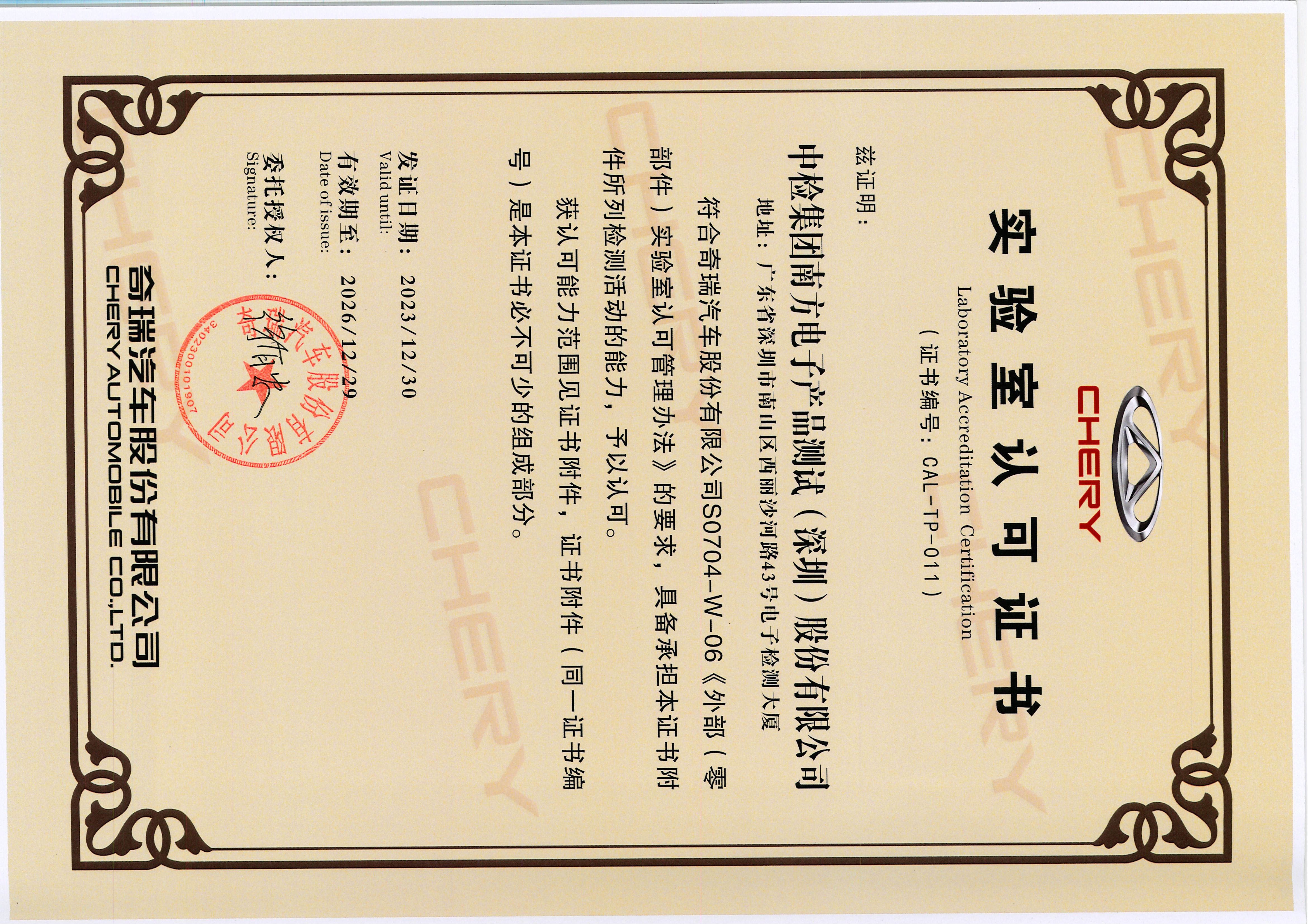 奇瑞股份实验室认可证书