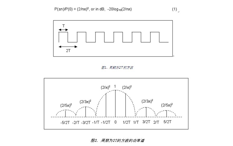 首先,将周期为2T的方波信号看作是数据速率为1/T的1010...不归零(NRZ)数据序列,如图1所示。该方波的功率谱如图2所示,其中零频率表示载波频率,f0。此时,f0由归一化的载波谱线和处于(1/2T)奇数倍频点的谱线组成。每条谱线的功率与载波(零频率)谱线的功率之比可由下式给出: